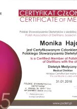 Certyfikat Członkowska Polskiego Stowarzyszenia Dietetyków