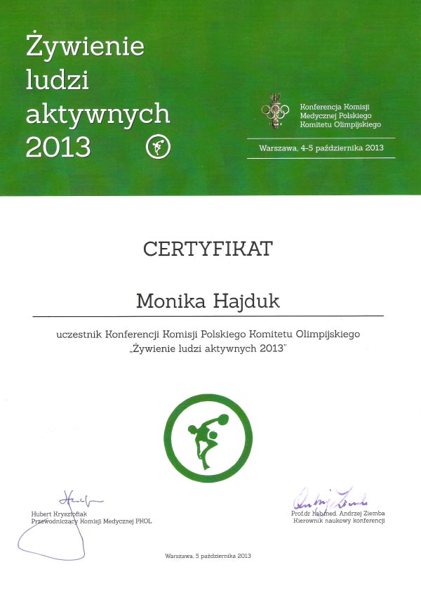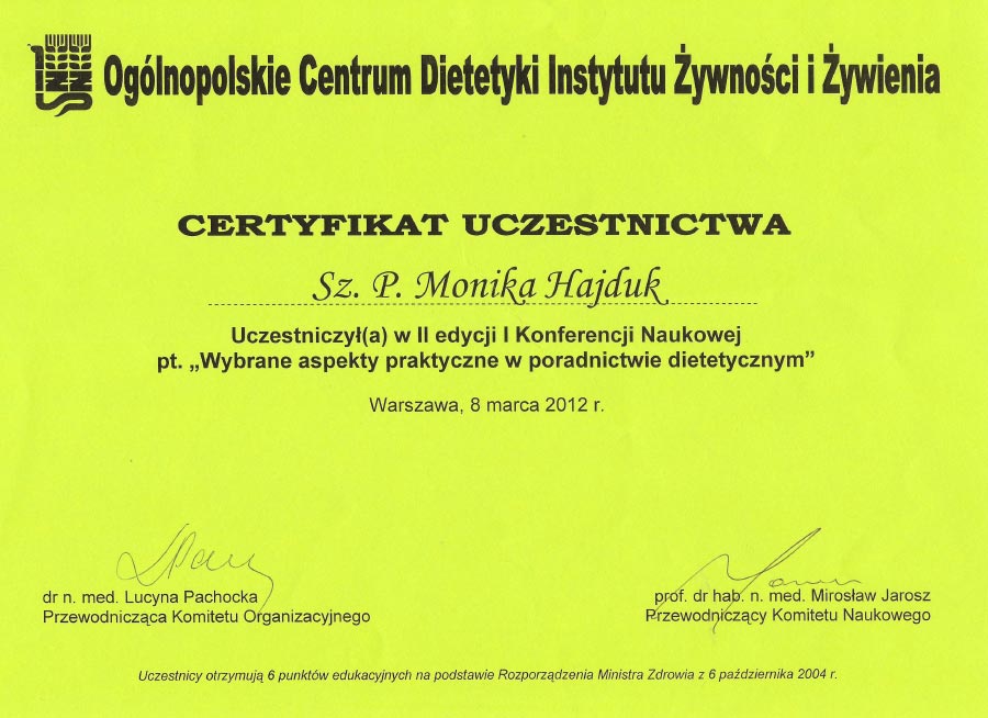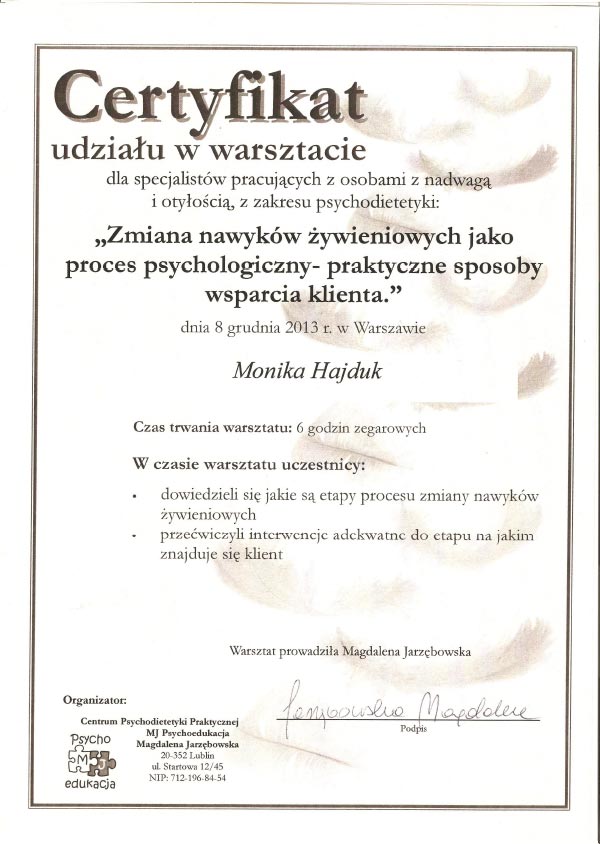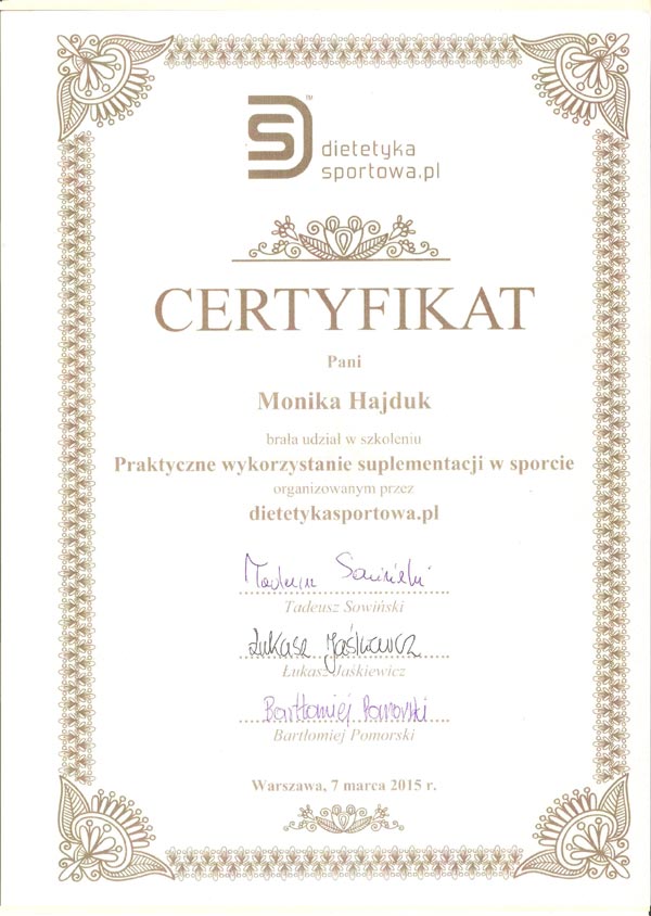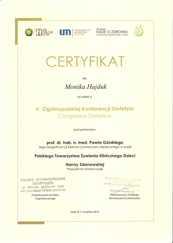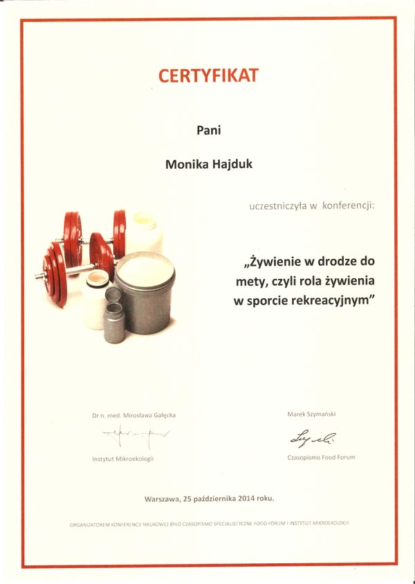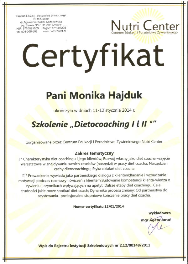 Certyfikat „Dietcoaching” I i II stopień