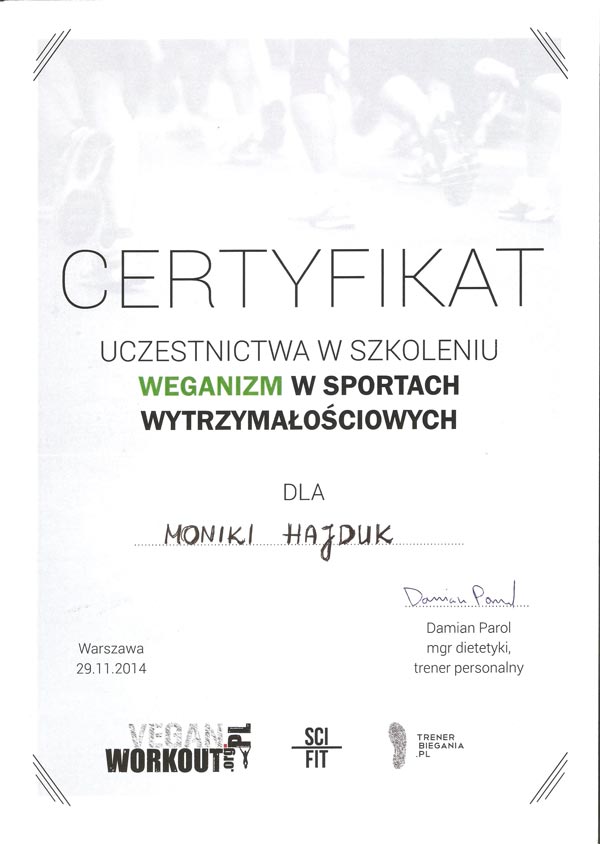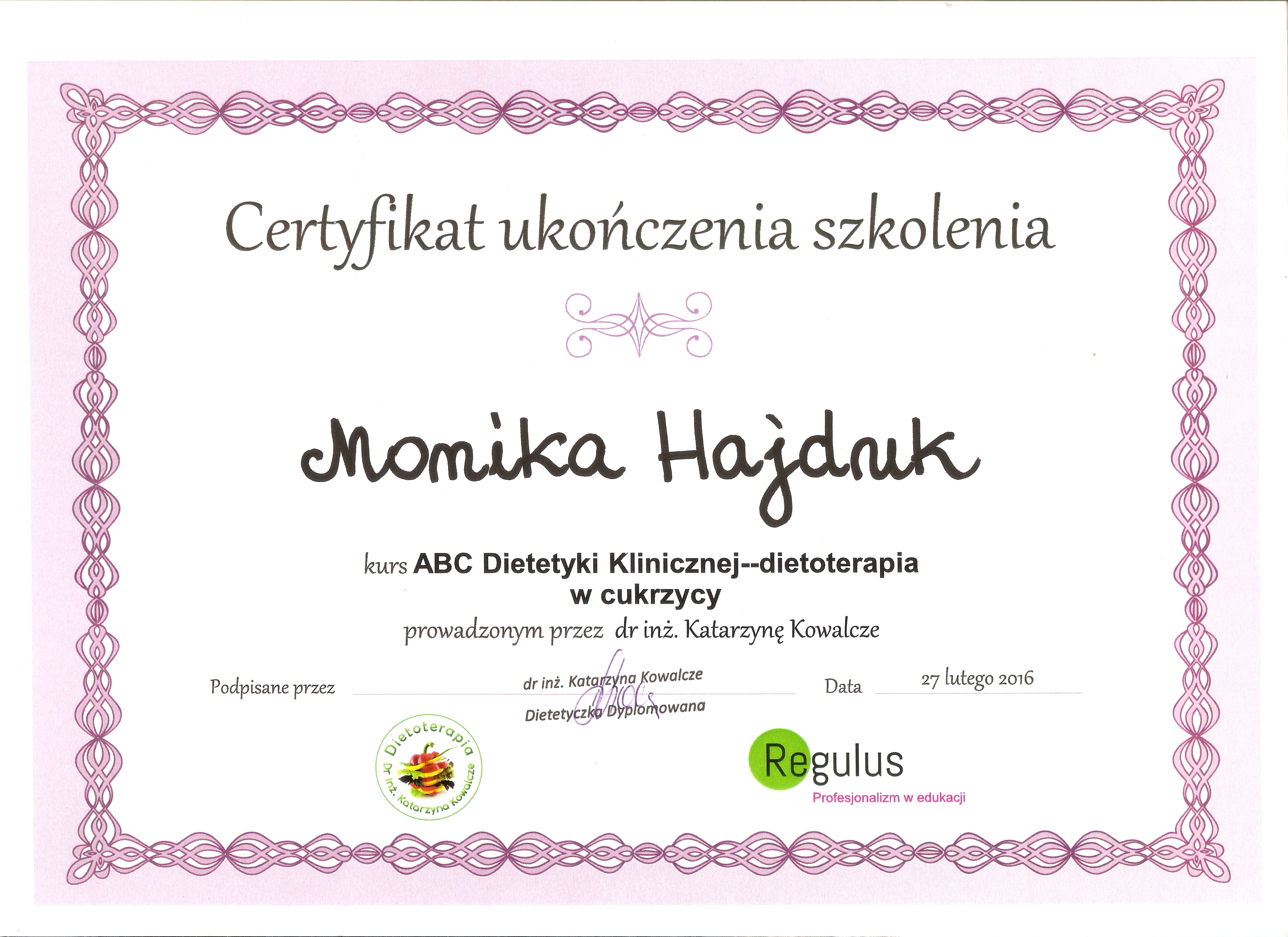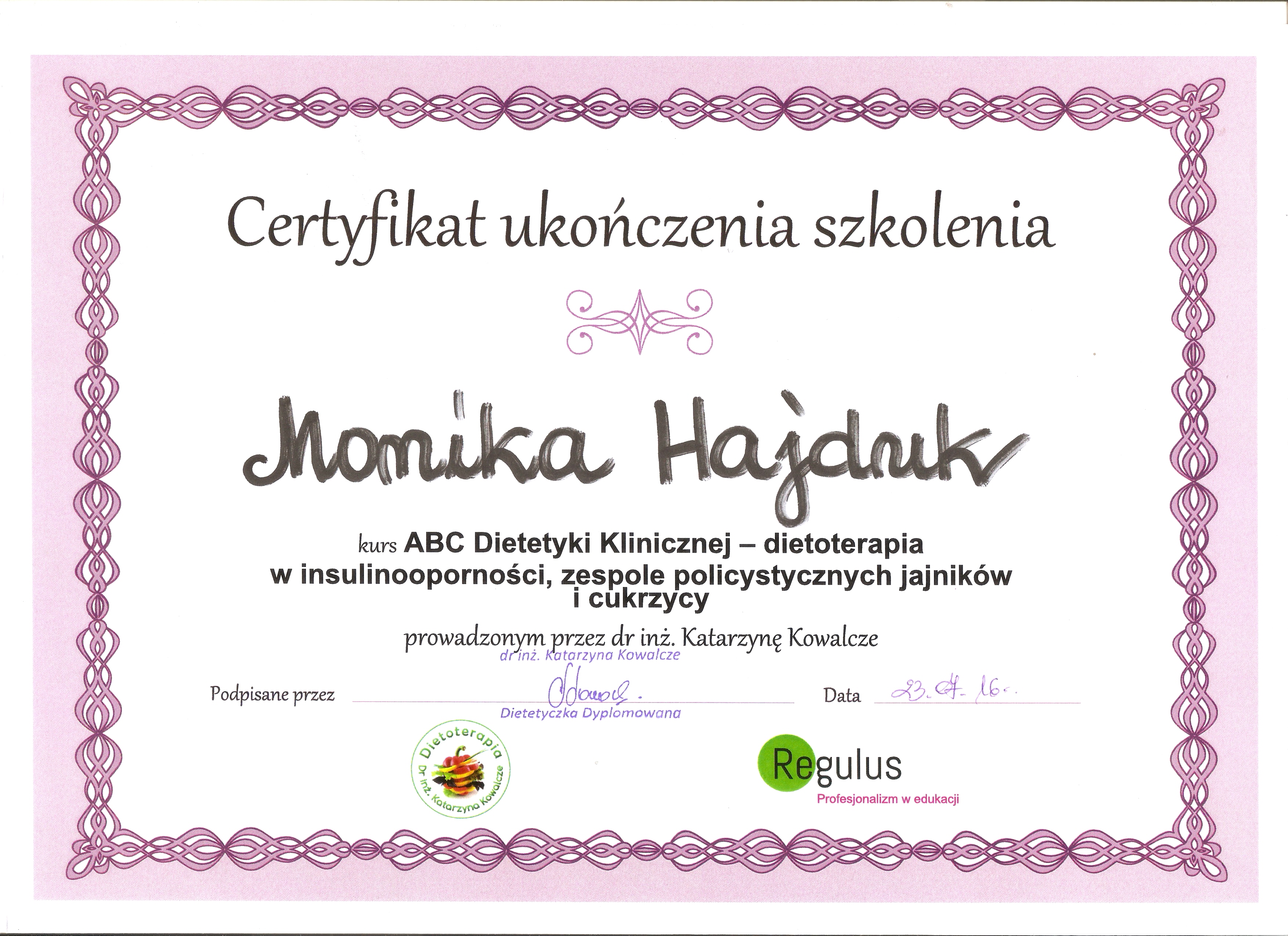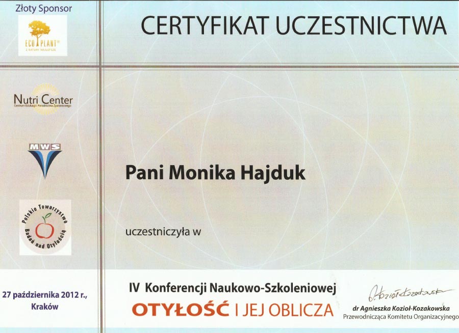 Certyfikat „Dietcoaching” I i II stopień