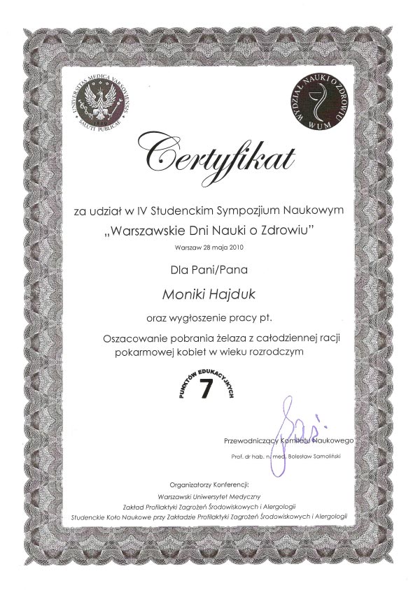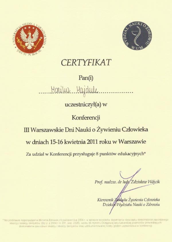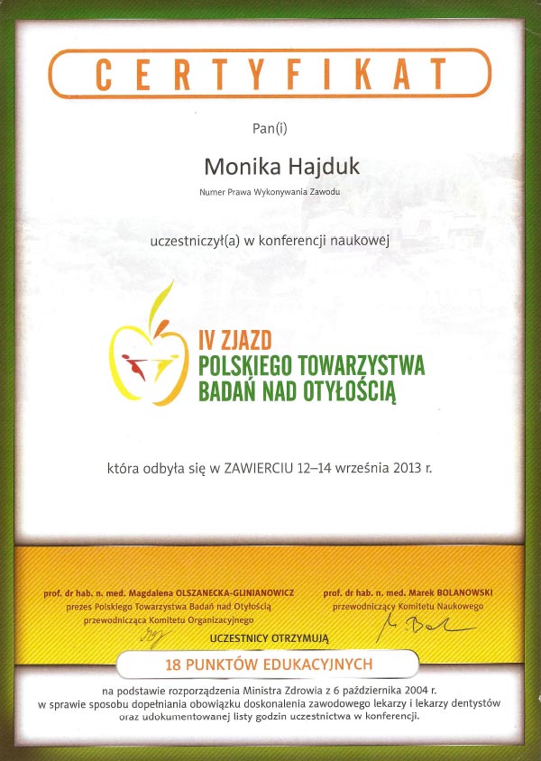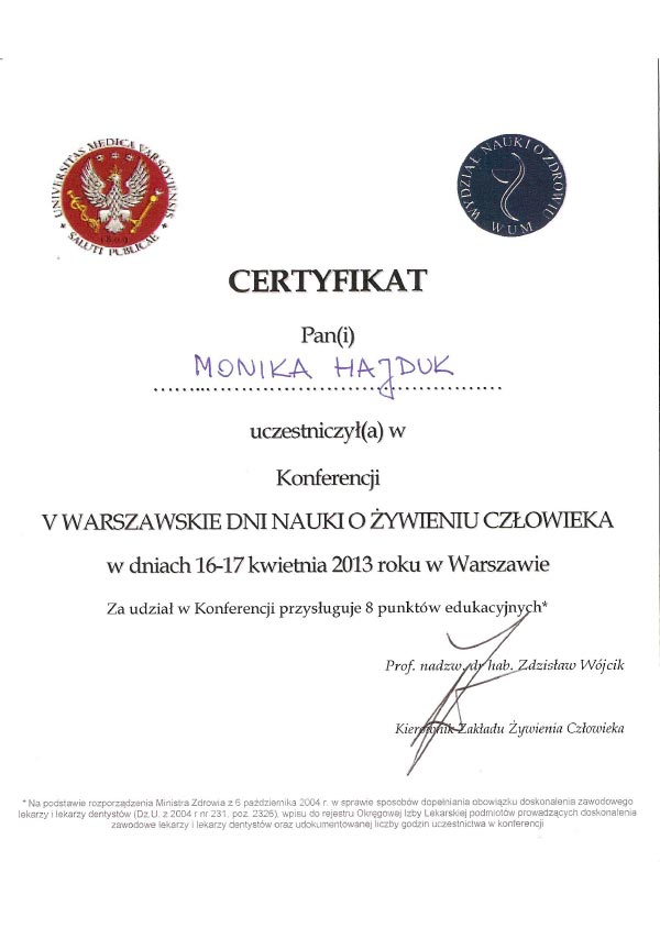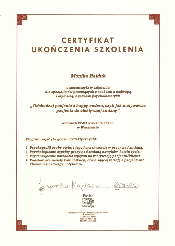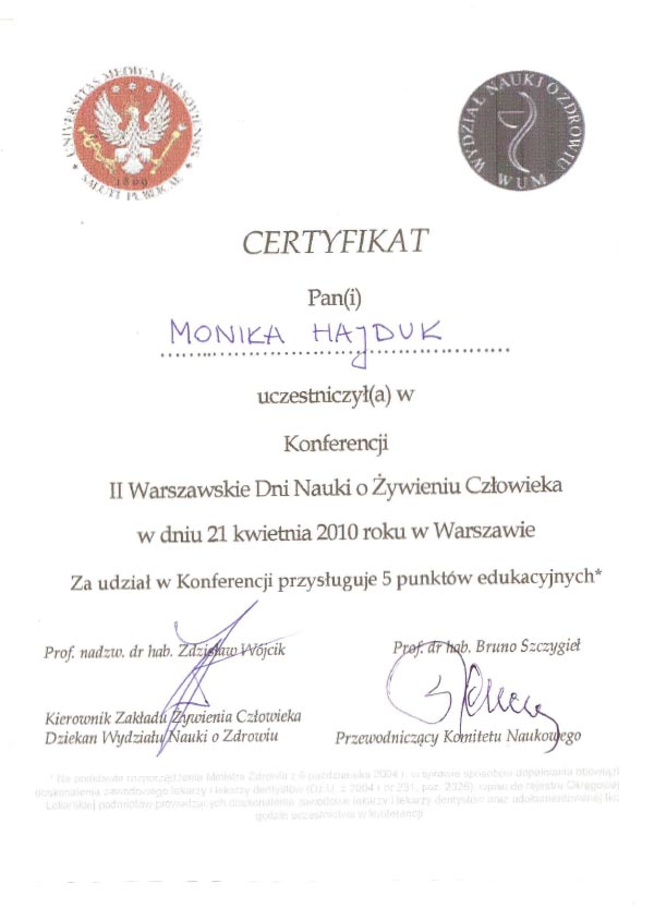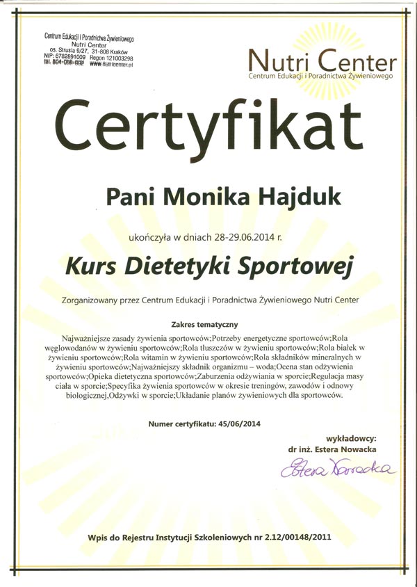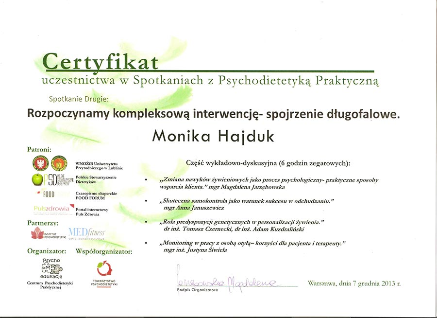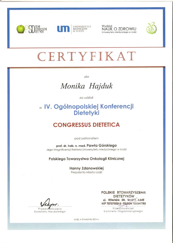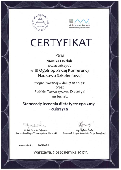 Dodatkowo uczestniczę w kursach na certyfikowanego międzynarodowego specjalistę w zakresie leczenia otyłości (SCOPE) akredytowanego przez Międzynarodowe Towarzystwo Badań nad Otyłością. Od ponad 7 lat prowadzę konsultacje dietetyczne i przygotowuję plany żywieniowe.