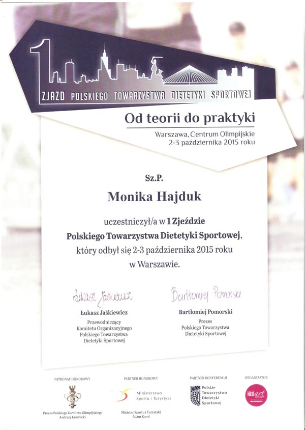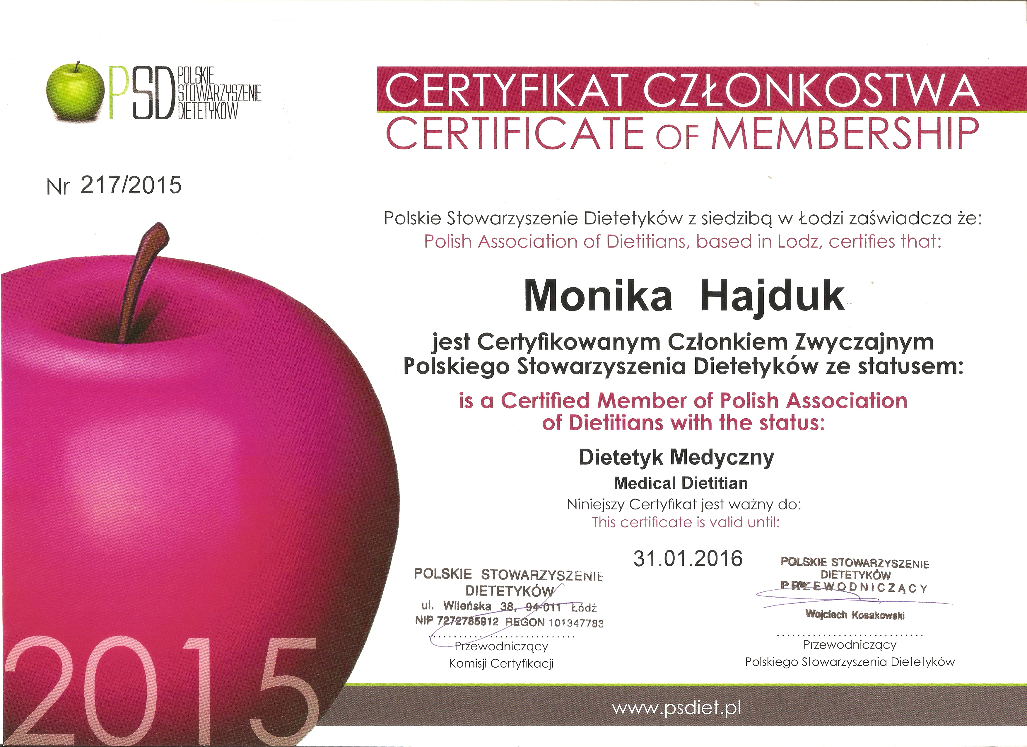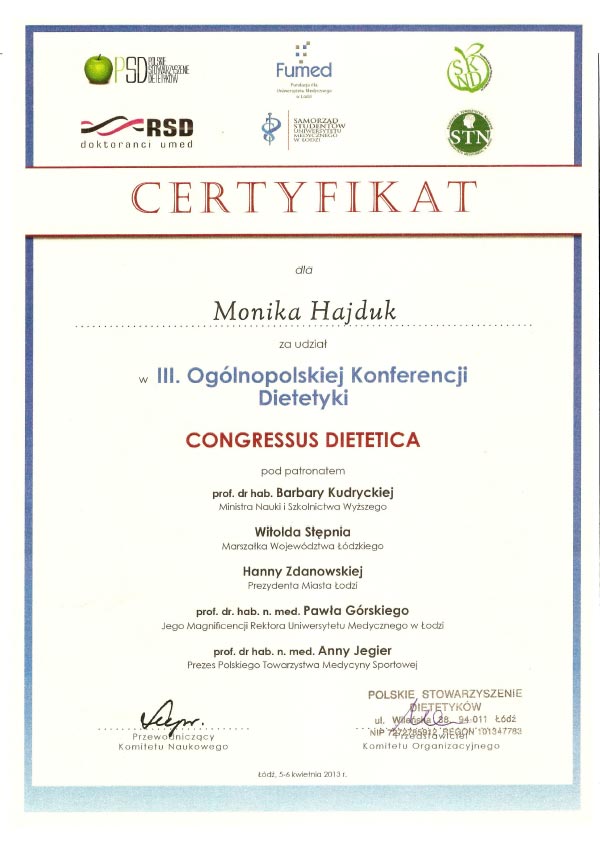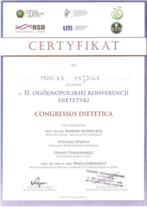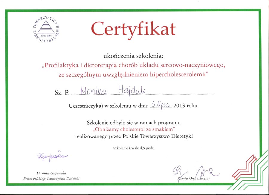 Certyfikat Członkowska Polskiego Stowarzyszenia Dietetyków